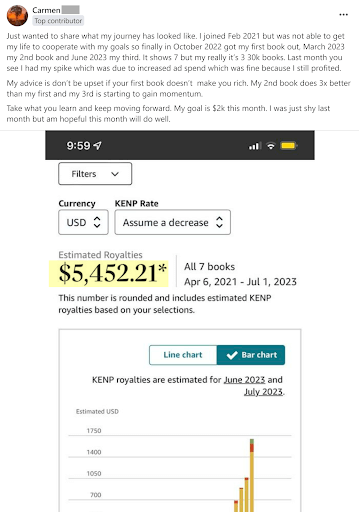 Success in Kindle Unlimited comes down to strategy; the right tools can make all the difference. Our proven process has helped thousands of people launch successful publishing businesses. Carmen proved that commitment and strategy get results. Her first book took her longer than expected to publish, and she waited to hit her goals. However, her second book did much better, and her third is picking up, too!