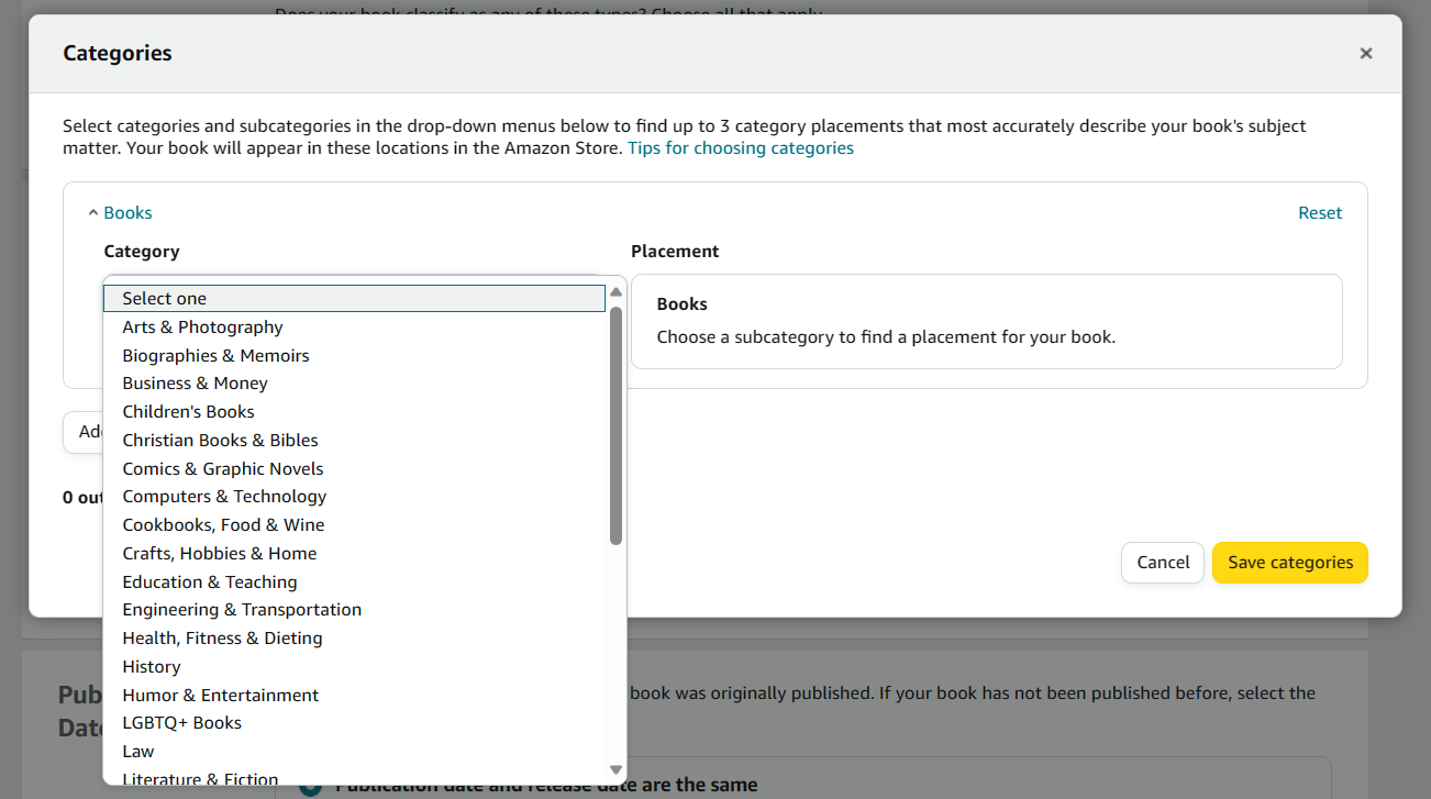 At this point, you'll be asked to select three categories that your book best fits under. Again, we can't stress this enough, Amazon wants the truth to help your book get seen by your ideal readers. If you pick a misleading category, you could get a warning from Amazon and risk eventual account bans.