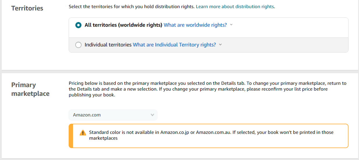 At this stage, you'll also choose the primary marketplace that you'd like to sell your book in. For most self-publishers, it will be the US marketplace, and later on, you'll have the opportunity to expand your book sales into other markets.