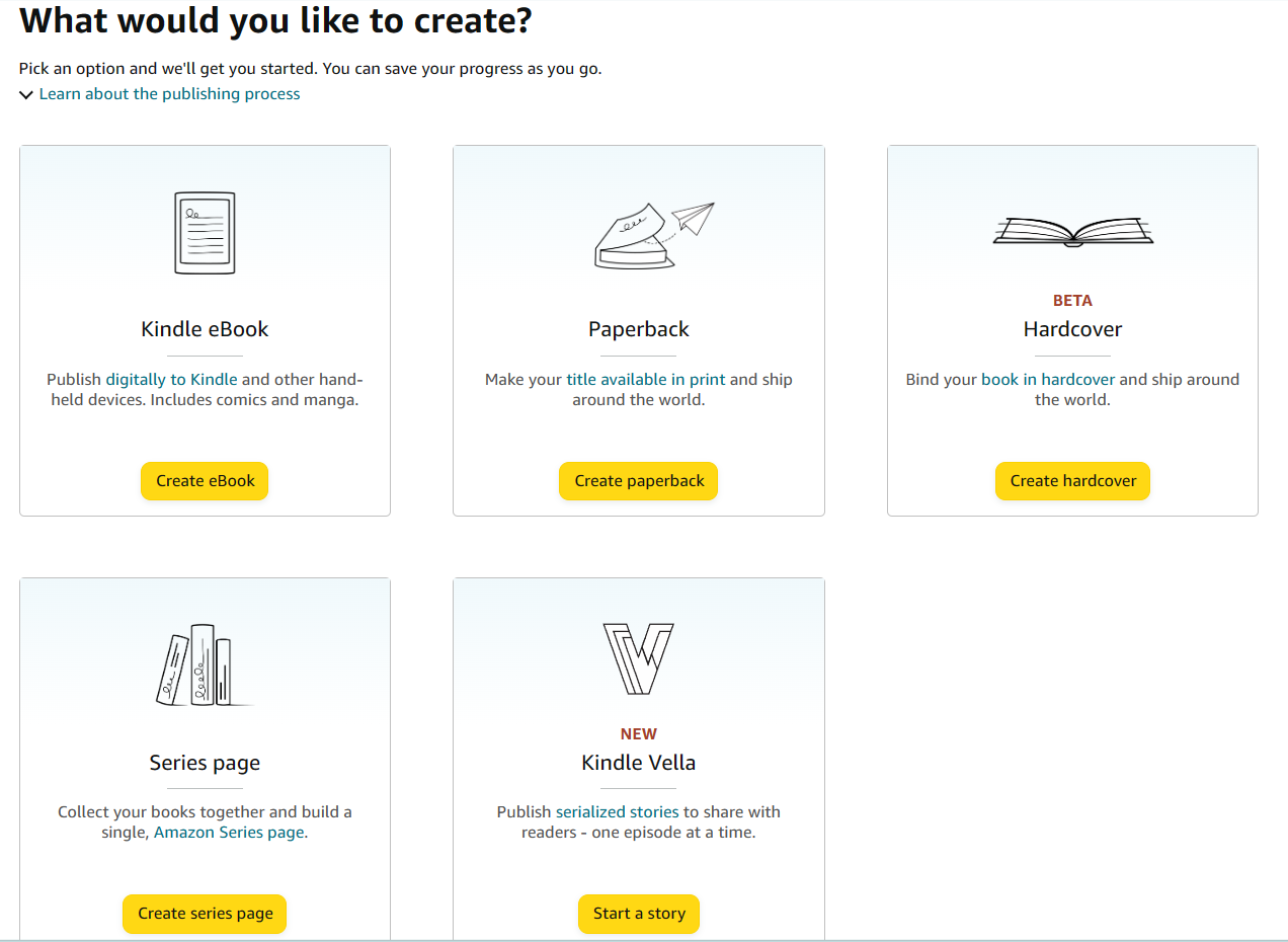 This page will ask you what you'd like to create. You'll eventually want to publish multiple formats of the same book, but most self-publishers tend to start with their paperback. Click "Create Paperback" to start setting up your book.