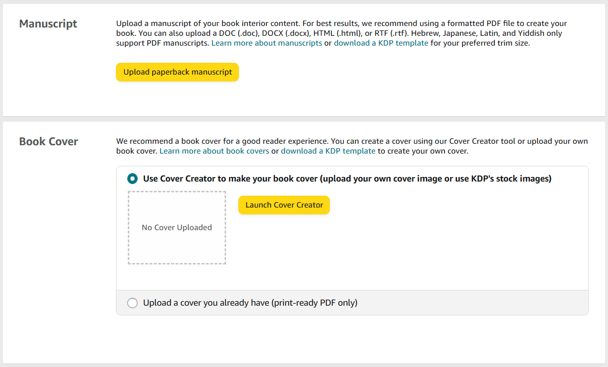 Amazon's KDP only allows file types depending on whether you're attempting to upload your paperback books or your eBook manuscript. Traditionally, it's easiest to upload a PDF for paperback and hardcover books or an ePub file for eBooks, but you will also need to upload your book cover separately.