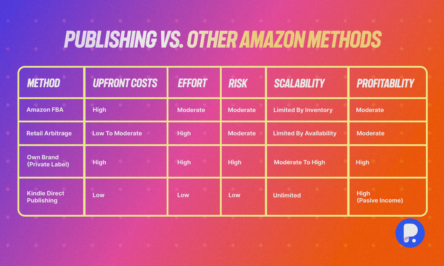 Unlike arbitrage or FBA, there’s no upper limit on how many books you can publish. Each new title adds another income stream.